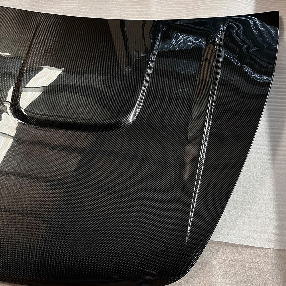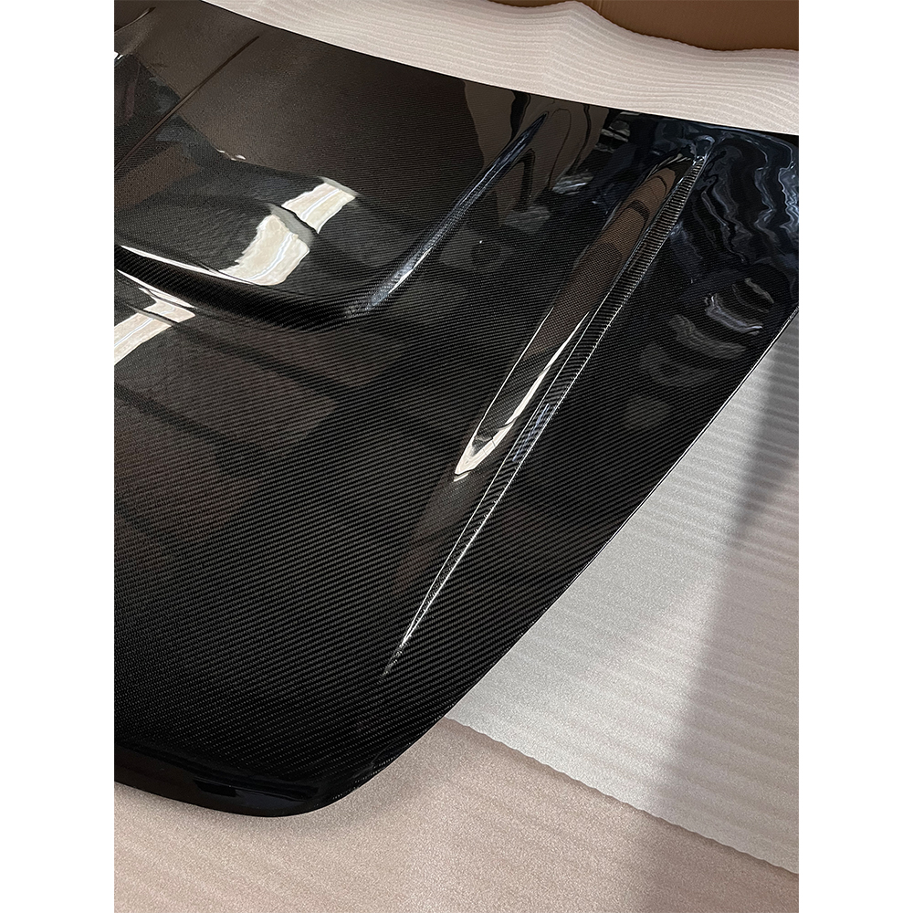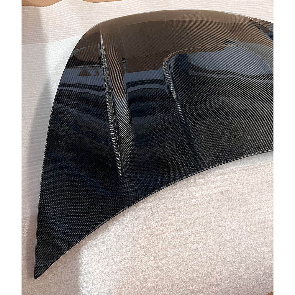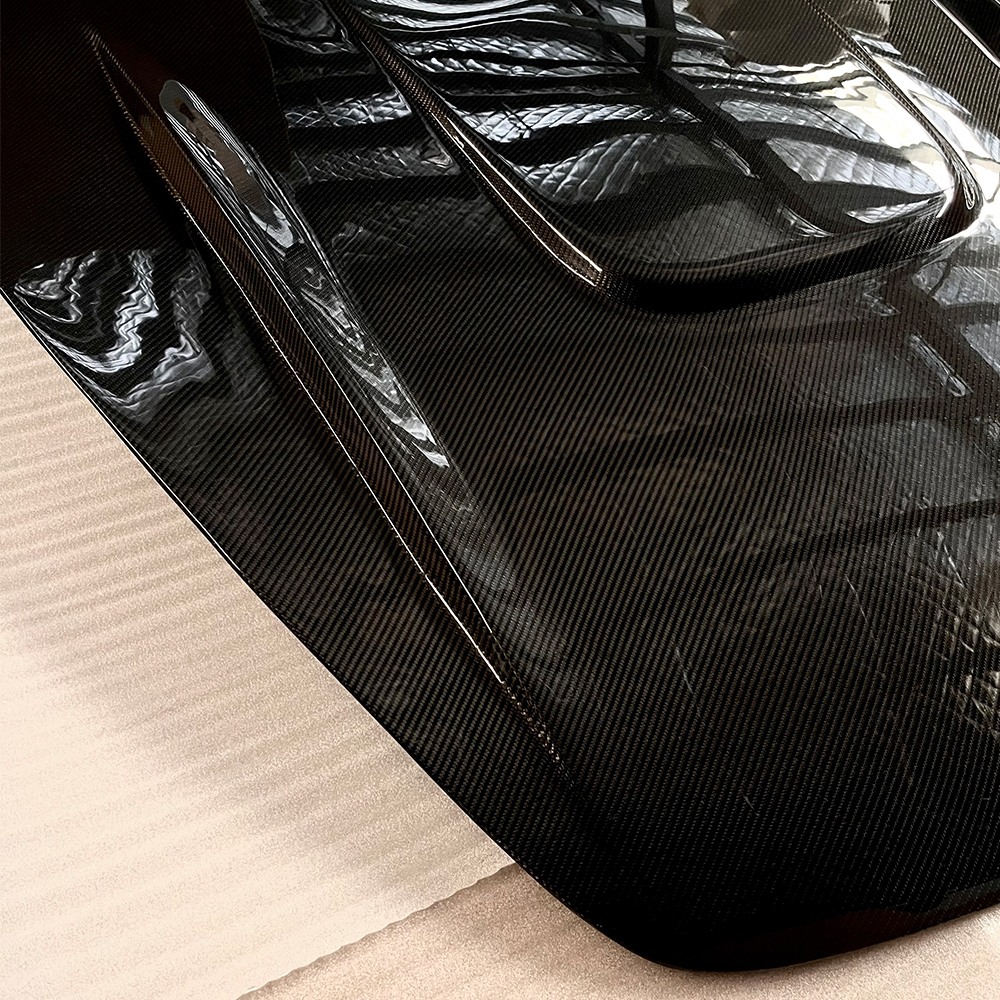 The forged carbon fiber hood specially customized for Tesla’s refreshed Y uses precision lamination technology to integrate multiple layers of carbon fiber composite structure, combining lightweight and high strength. The surface is treated with transparent varnish, presenting a deep and three-dimensional woven texture of carbon fiber. The finely interwoven warp and weft lines reflect a metallic luster in the sunlight, creating a strong visual impact. Compared to original car parts, carbon fiber materials effectively reduce vehicle weight, optimize handling response and range performance, and ensure high-speed stability and impact resistance through rigorous mechanical testing. The built-in flow guide structure improves heat dissipation efficiency and reduces high temperature losses to the motor. Accurately matching the installation point of the original car, replacing the original position without damage, seamlessly fitting without complex debugging, instantly turning the car into a symbol of street performance aesthetics.