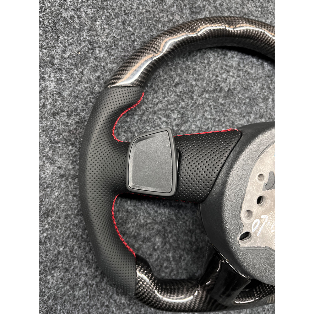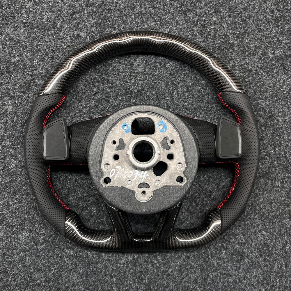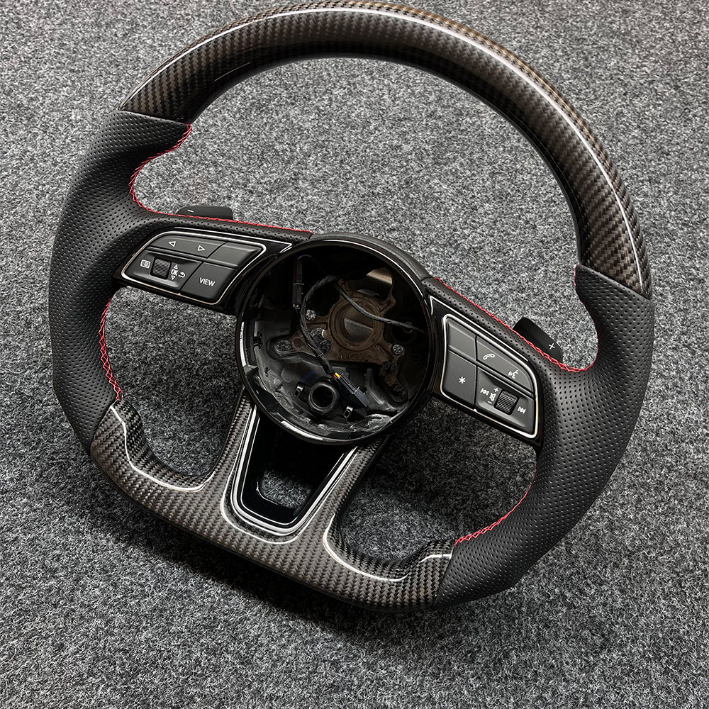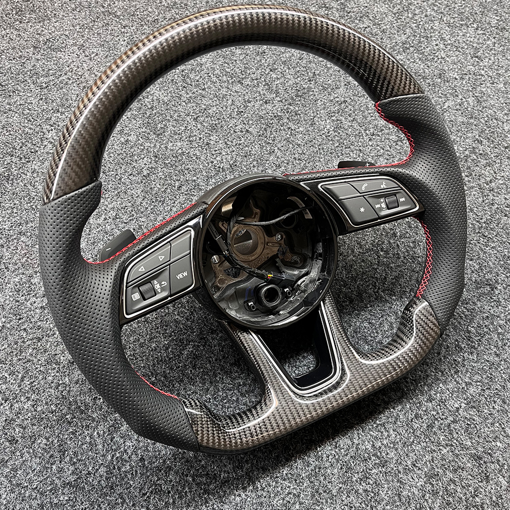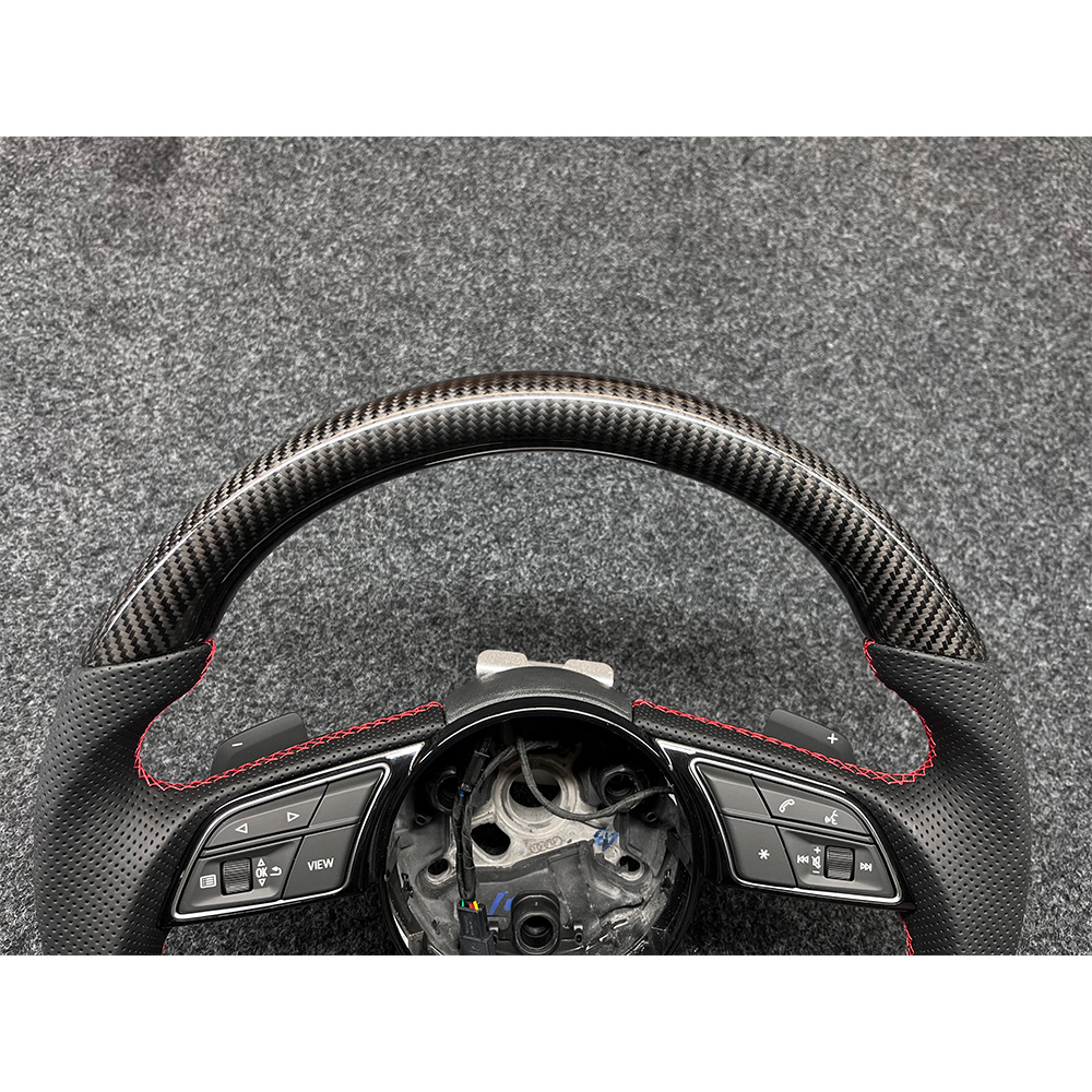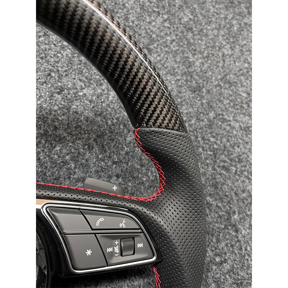 The Audi flat bottomed sports carbon fiber steering wheel adds color to your driving experience. Its upper and lower parts are made of 3K carbon fiber material, and the clear carbon fiber texture is not only a visual display of high-tech materials, but also instantly enhances the sporty atmosphere and technological sense inside the car. Carbon fiber also has ultra-high strength, effectively reducing the burden on the steering system and making the steering control more sensitive. The grip part is made of high-quality perforated leather, which is soft and fits snugly against the palm. The perforated leather greatly enhances breathability, making it less likely for the palm to sweat and slip even after prolonged driving, ensuring safety and stability during the driving process. Paired with bright and eye-catching red stitching, it creates a sharp contrast with the deep texture of carbon fiber.