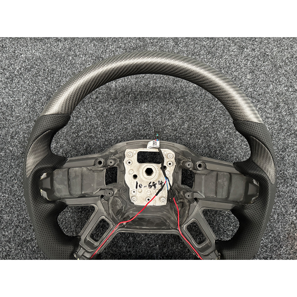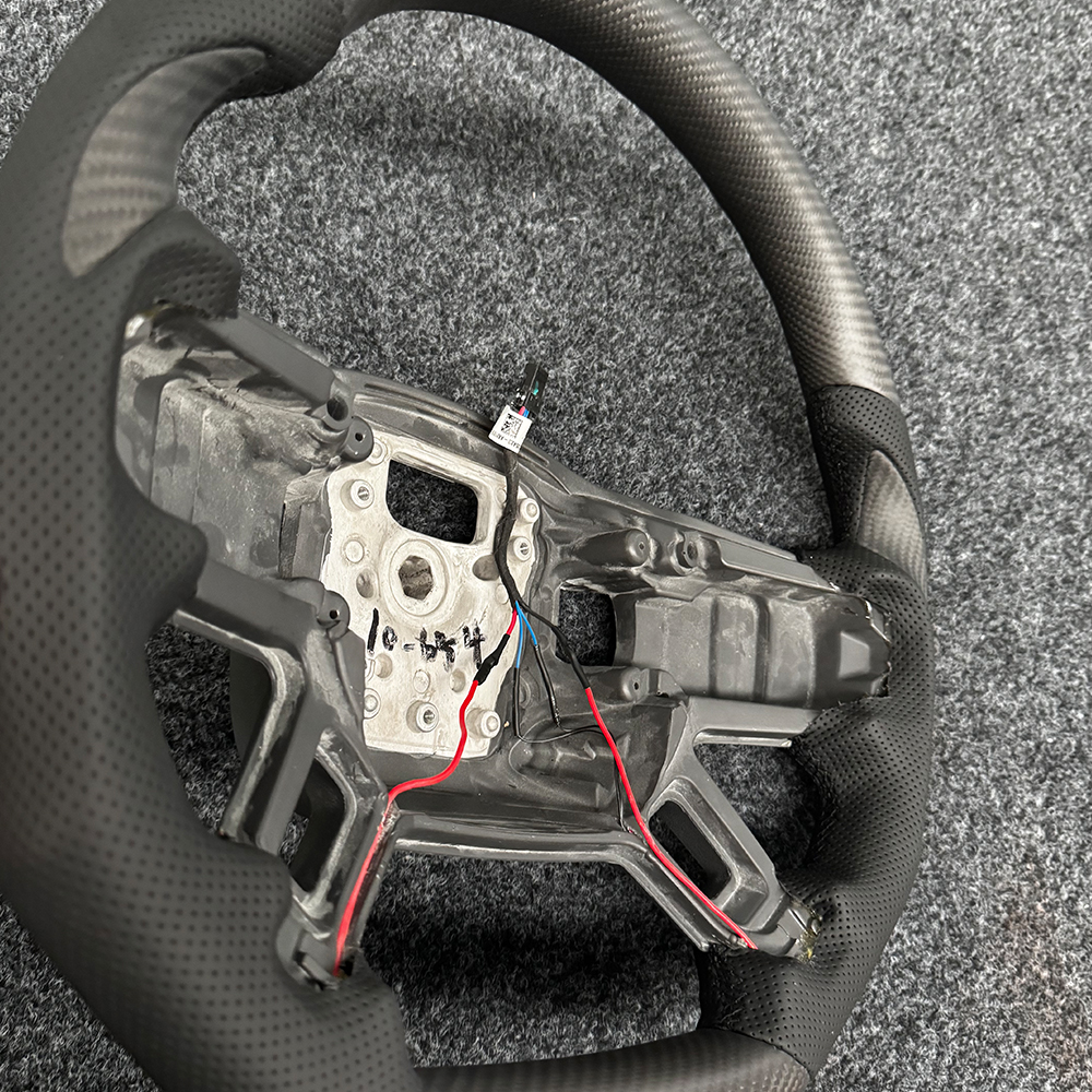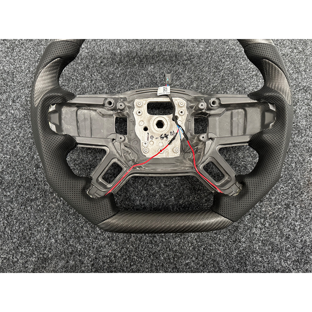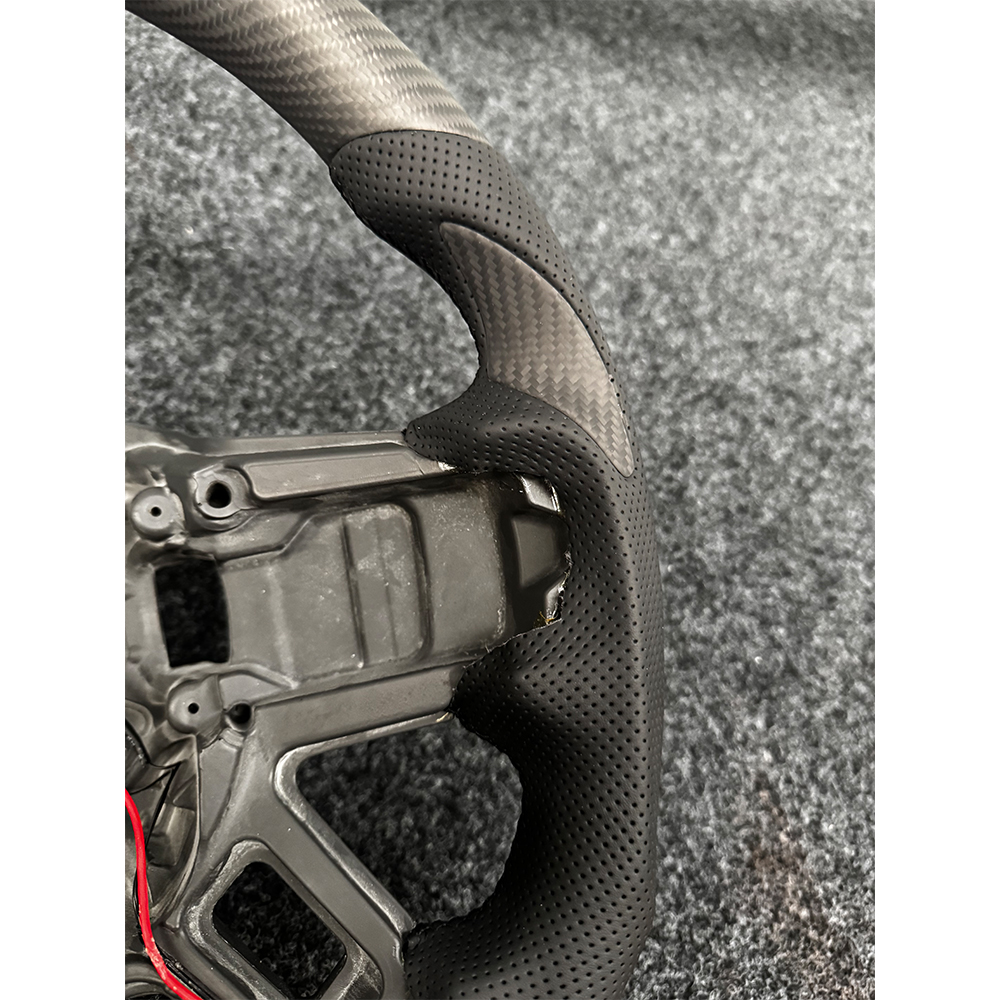 Refoam the entire steering wheel to create a new shape, using carbon fiber material for the top and bottom, perforated leather material for the left and right, and carbon fiber blade patches