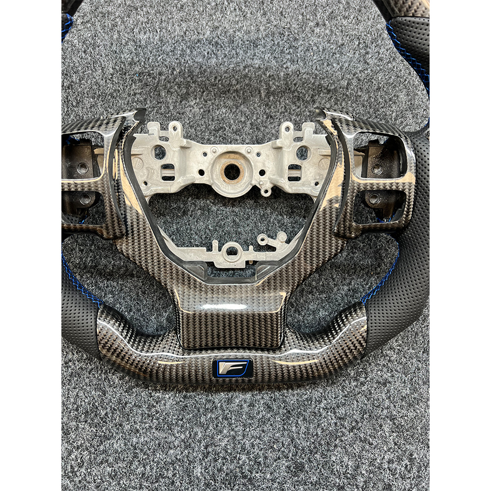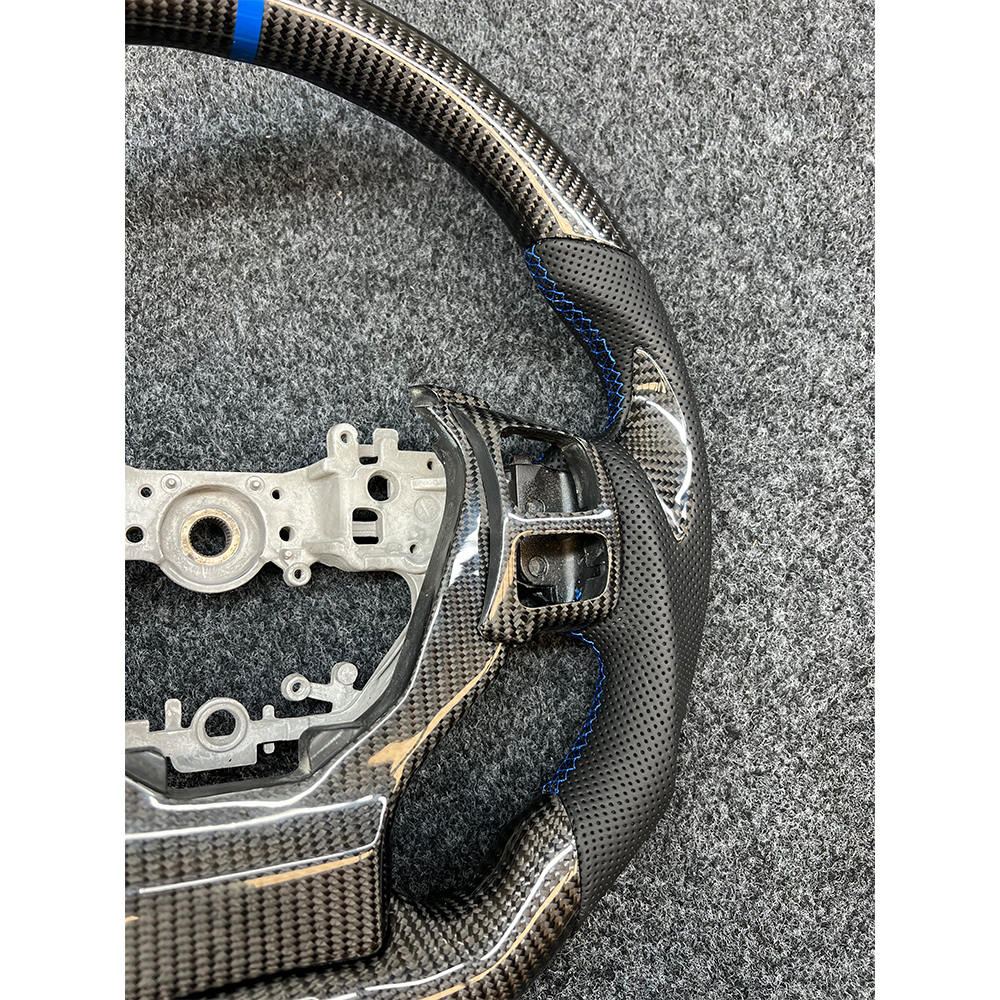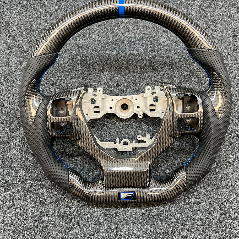 The F-standard sport carbon fiber steering wheel specially designed for the Lexus IS series provides you with the ultimate driving experience! The left and right sides are made of black perforated leather, which is breathable and wear-resistant. The blue stitching is embellished, giving it a luxurious feel. 3. Paired with carbon fiber blade patches at 9 o’clock, the operation is more convenient. The blue return mark above makes it easy to find the direction. There are also carbon fiber decorative covers and button frames, with an explosive texture that makes your driving full of passion!