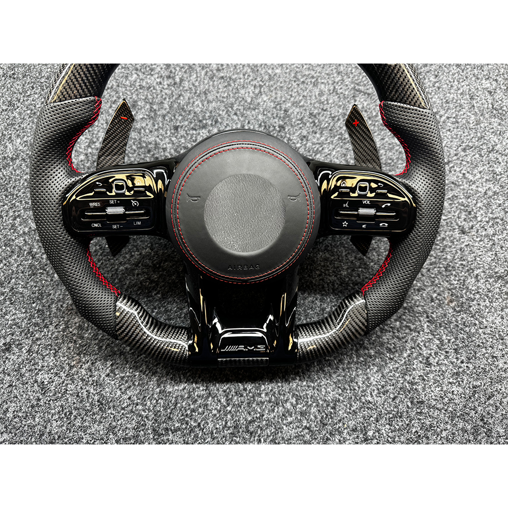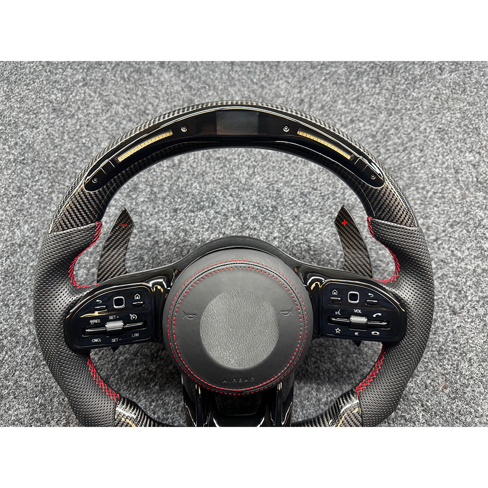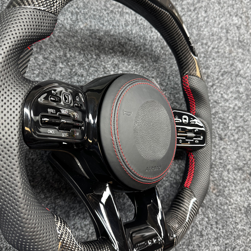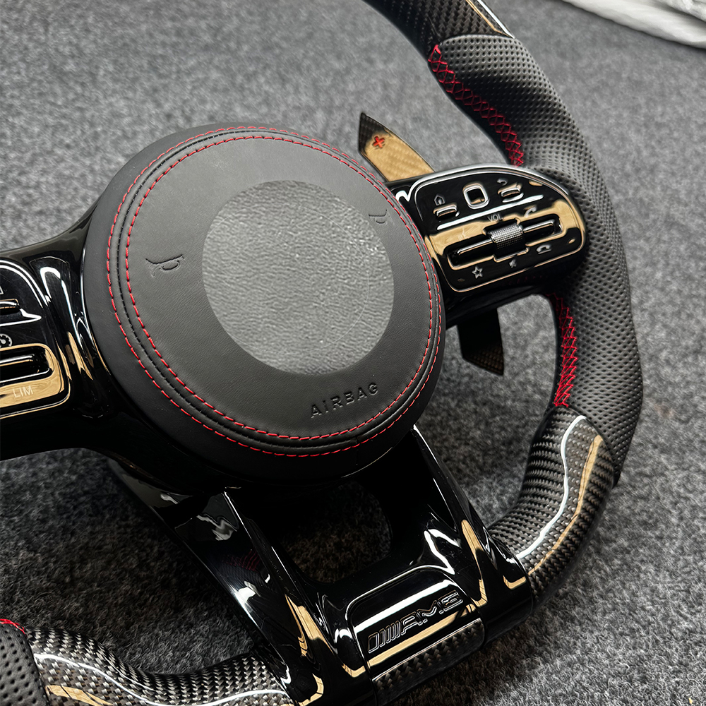 The steering wheel is made of carbon fiber material for the top and bottom, perforated leather material for the left and right, carbon fiber material for the shift paddles, LED sports lights, and customizable airbag cover